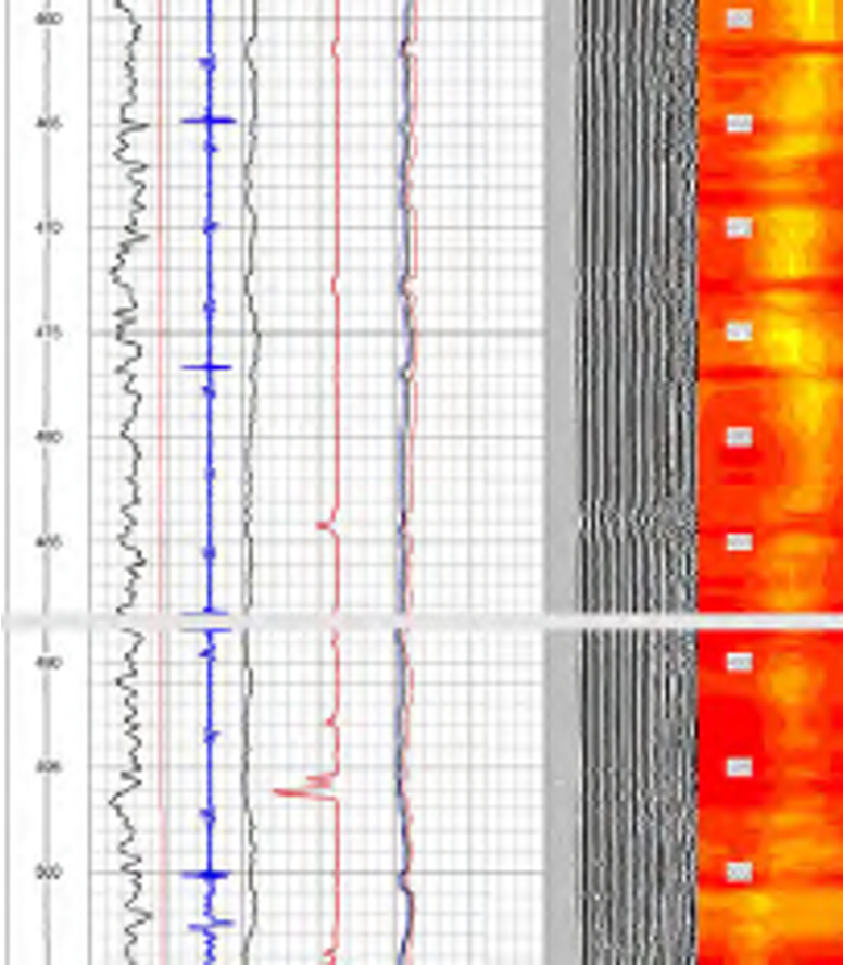 The cement bond log showed consistent cement coverage throughout the cemented interval. The two snapshots below highlight the strong cement presence at different depths — one near the TOC (Top of Cement) and the other closer to TD.