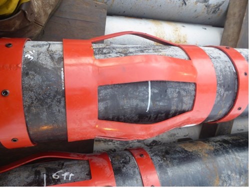 The customer initially ran casing with a zinc alloy solid body centralizers from a different supplier. During the initial run the casing was pulled out of hole (POOH) as the customer planned to clean the bottom hole assembly to clear out the ledges/restrictions. During POOH, the casing got stuck due to casing parting near the reamer shoe connection and the solid body centralizers and stop collars broke up and were lost downhole.