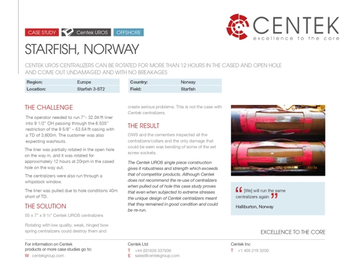 The Centek UROS single piece construction gives it robustness and strength which exceeds that of competitor products. Although Centek does not recommend the re-use of centralizers when pulled out of hole this case study proves that even when subjected to extreme stresses the unique design of Centek centralizers meant that they remained in good condition and could be re-run.