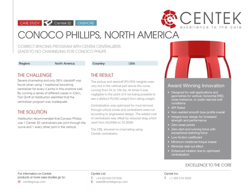 Halliburton recommended that Conoco Phillips use 1 Centek S2 centralizer per joint through the curve and 1 every other joint in the vertical.