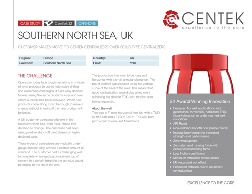 A UK customer operating offshore in the Southern North Sea, York Field, made that decision to change. The customer had been using positive stand-off centralizers on highly deviated wells.
