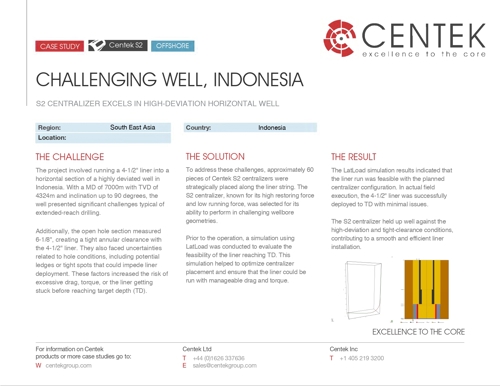 The project involved running a 4-1/2" liner into a horizontal section of a highly deviated well in Indonesia. With a MD of 7000m with TVD of 4324m and inclination up to 90 degrees, the well presented significant challenges typical of extended-reach drilling. Additionally, the open hole section measured 6-1/8", creating a tight annular clearance with the 4-1/2" liner. They also faced uncertainties related to hole conditions, including potential ledges or tight spots that could impede liner deployment. These factors increased the risk of excessive drag, torque, or the liner getting stuck before reaching target depth (TD).
