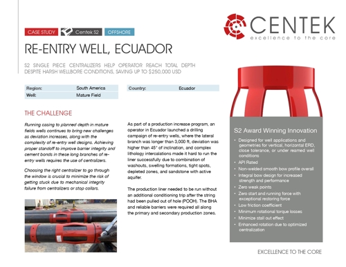 The use of Centek S2 centralizers ensured casing achieved the planned depth. If planned depth had not been achieved, the change in completion plan would have caused difficulties and additional cost for the operator. The liner with 96 x Centek centralizers was able to go through out the window without any issues and was run to bottom, washing and reaming along the open hole due to the complex lithology intercalations and wellbore conditions. The heavy duty single- piece design of Centek S2 centralizers required zero running force and allowed a two centralizer per joint solution, providing adequate standoff
