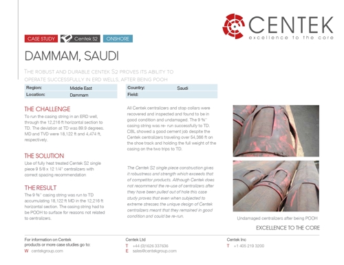 The Centek S2 single piece construction gives it robustness and strength which exceeds that of competitor products. Although Centek does not recommend the re-use of centralizers after they have been pulled out of hole this case study proves that even when subjected to extreme stresses the unique design of Centek centralizers meant that they remained in good condition and could be re-run.