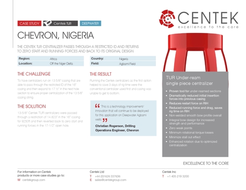 13 5/8” Centek TUR centralizers were passed through a restriction of 14.823” in the 16” casing for 9,250ft and then reverted back to zero start and running forces in the 17 1/2” open hole.