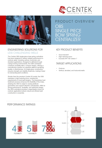 Centek OBS and OBS-2 single-piece bow spring centralizers deliver reliable performance in onshore wells, including vertical, horizontal, and deviated applications.