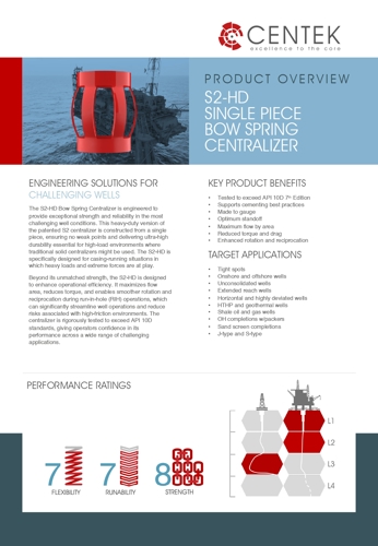 This heavy-duty version of the patented S2 centralizer is constructed from a single piece, ensuring no weak points and delivering ultra-high durability essential for high-load environments where traditional solid centralizers might be used. The S2-HD is specifically designed for casing-running situations in which heavy loads and extreme forces are at play.
