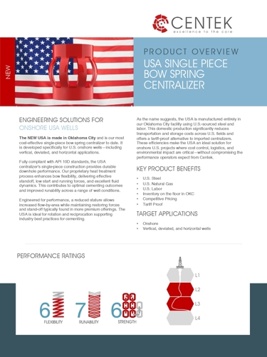 As the name suggests, the USA is manufactured entirely in our Oklahoma City facility using U.S.-sourced steel and labor. This domestic production significantly reduces transportation and storage costs across U.S. fields and offers a tariff-proof alternative to imported centralizers. These efficiencies make the USA an ideal solution for onshore U.S. projects where cost control, logistics, and environmental impact are critical—without compromising the performance operators expect from Centek.