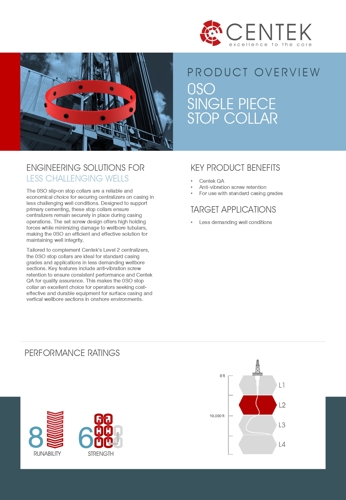 0SO stop collars are developed as counterparts to Centek’s Level 2 range of centralizers for less challenging wellbore sections.