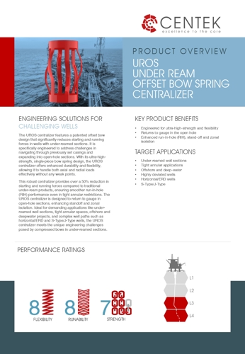 It is specifically engineered to address challenges in navigating through previously set casings and expanding into open-hole sections. With its ultra-high-strength, single-piece bow spring design, the UROS centralizer offers enhanced durability and flexibility, allowing it to handle both axial and radial loads effectively without any weak points.